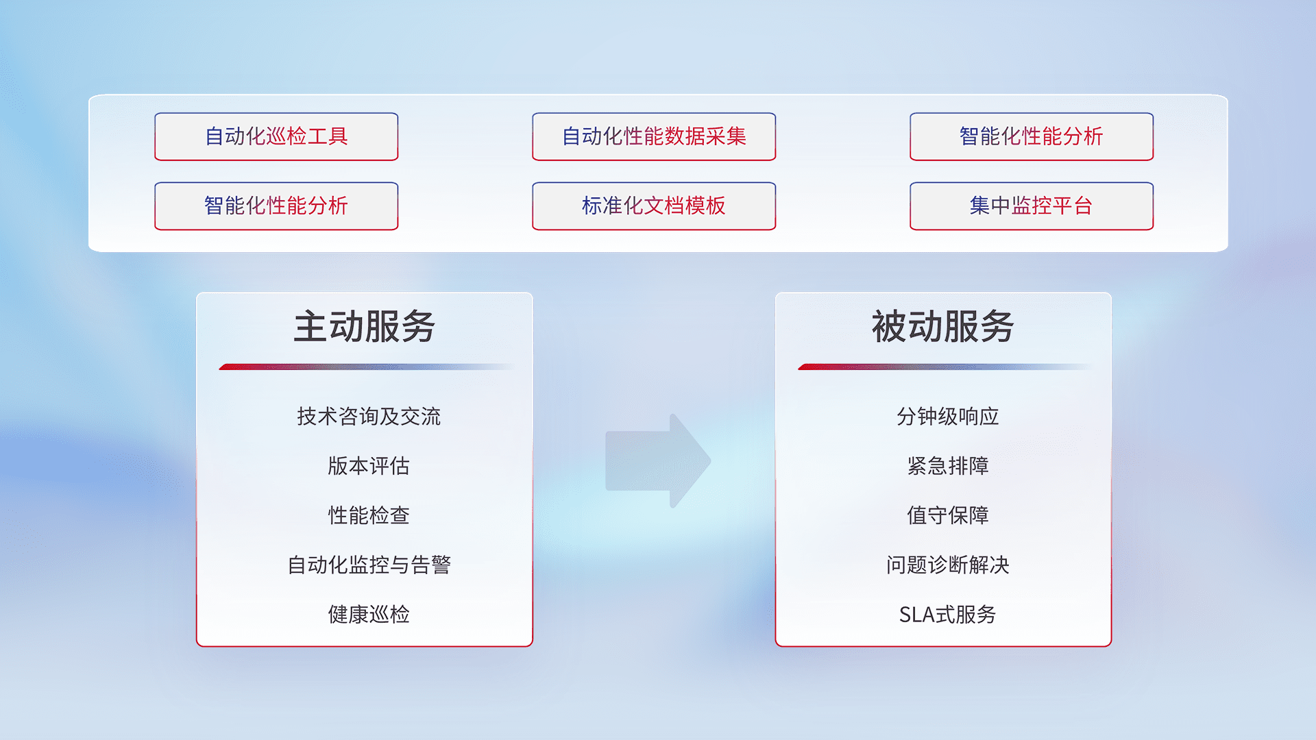 智能化工具和标准化文档,,,,保障服务质量,,提供主动服务(包含技术咨询、、、、版本评估、、性能检查、、自动化监控与告警、、、、健康巡检)和被动服务包含(分钟级响应、、、、紧急排障、、、、值守保障、、问题诊断解决、、SLA服务)。。。