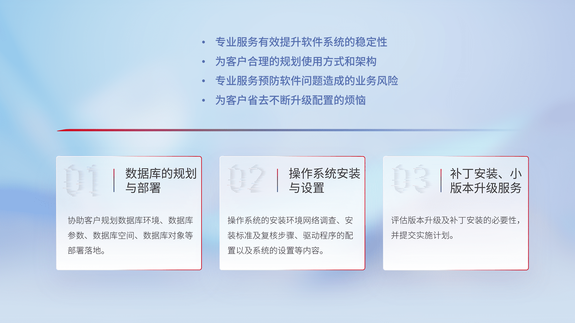 为客户提供软件规模升级、、、快速部署、、按需配置的专业服务,,从数据库的规划与部署到操作系统的安装与设置,,,,再到补丁安装和小版本升级提供支持。。。。